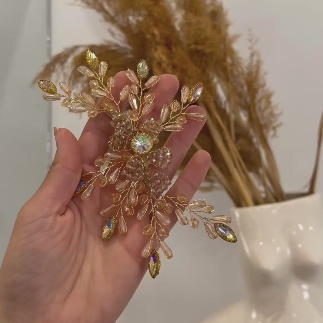Sublimez votre coiffure avec ce somptueux bijou de tête doré, orné de cristaux scintillants et de perles délicates. Son design raffiné apporte une touche de glamour et de sophistication à votre tenue, parfait pour les mariées et les grandes occasions.