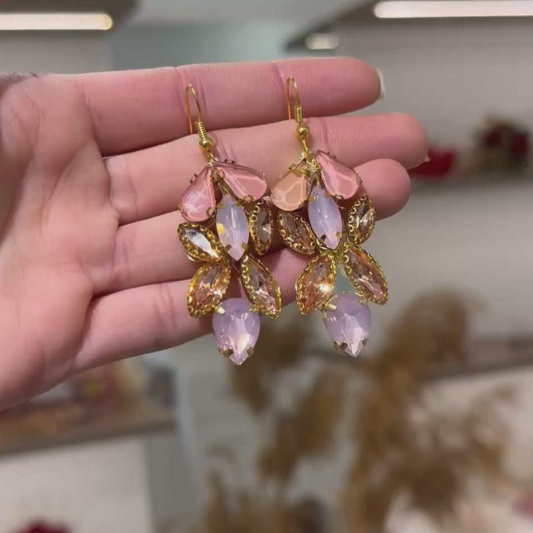 Ces boucles d’oreilles artisanales apportent une touche de raffinement et de charme à votre tenue de mariage ou de cérémonie. Leur design finement travaillé, agrémenté de cristaux et de perles délicats, illumine vos traits et complète parfaitement votre look.