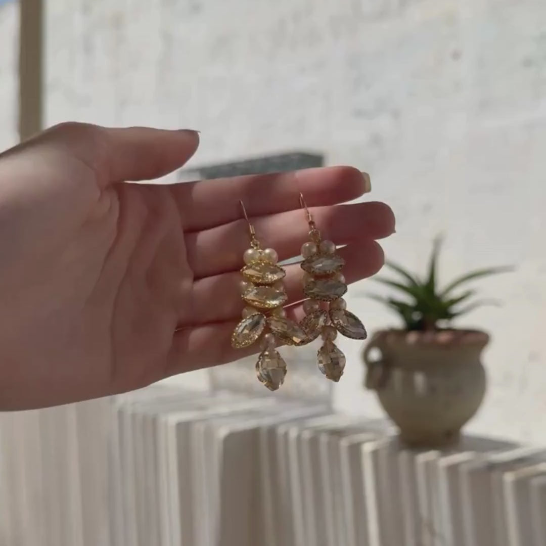 Ces boucles d’oreilles artisanales apportent une touche de raffinement et de charme à votre tenue de mariage ou de cérémonie. Leur design finement travaillé, agrémenté de cristaux et de perles délicats, illumine vos traits et complète parfaitement votre look.