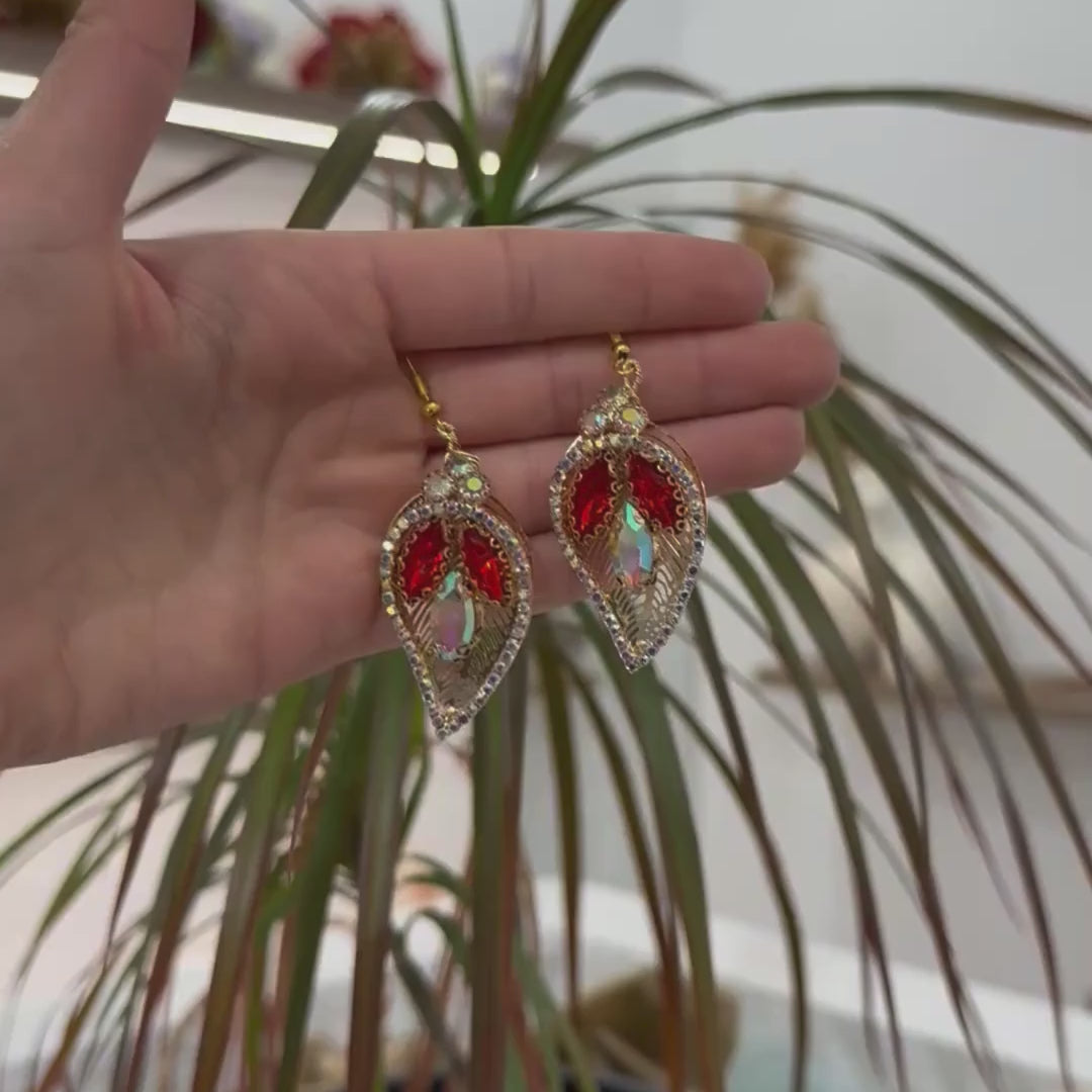 Ces boucles d'oreilles élégantes en cristal rouge apporteront une touche de sophistication à votre look. Leur design unique en forme de feuille met en valeur des cristaux scintillants rouges et roses, offrant un effet lumineux captivant. Ces pierres, soigneusement disposées, ajoutent une note raffinée et glamour, parfaite pour les occasions spéciales.