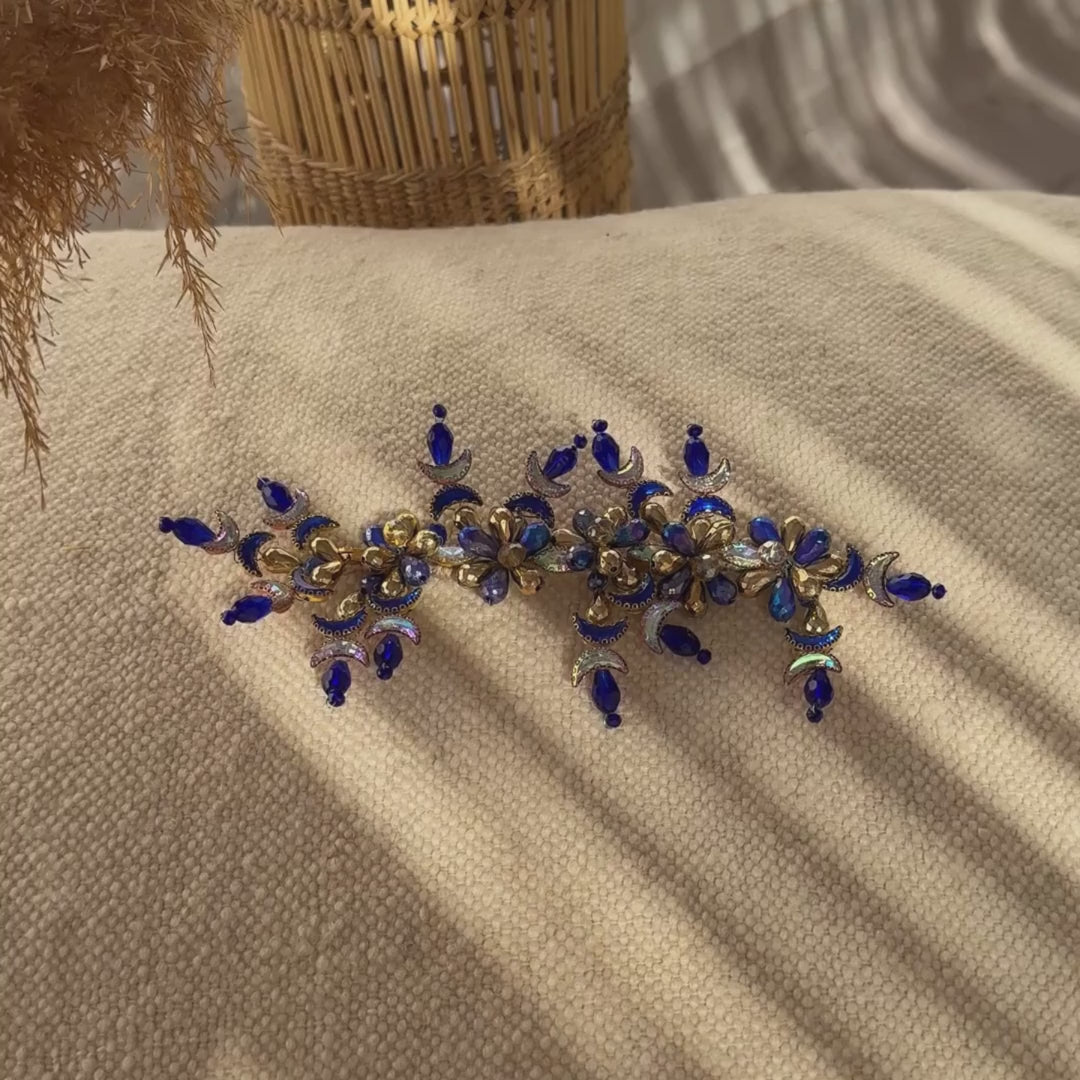 Cette broche au motif floral séduit par l’intensité de son bleu profond sublimé par des finitions dorées lumineuses. Ornée de pierres décoratives et réalisée avec un travail minutieux, elle apporte instantanément une touche élégante et sophistiquée à vos tenues. Parfaite pour une occasion spéciale ou pour rehausser un look avec raffinement, cette pièce artisanale allie charme et modernité.