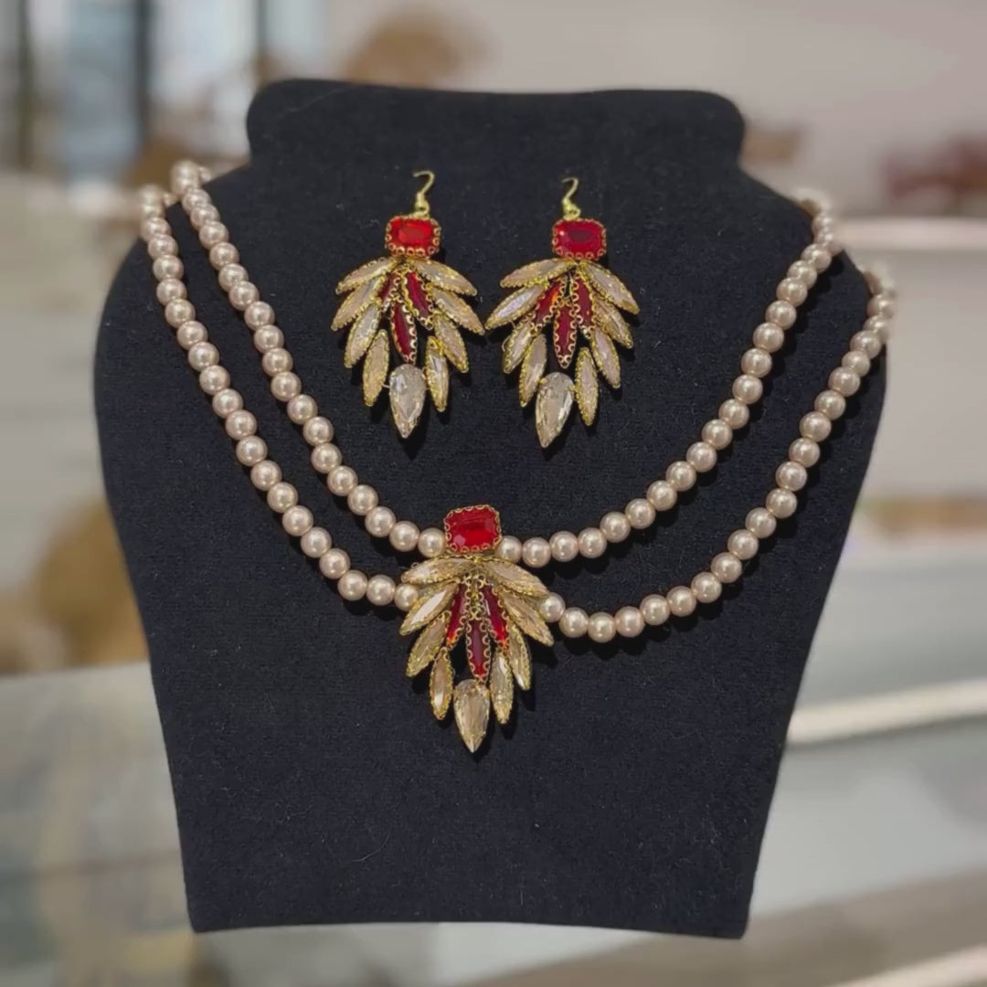 Collier Avec boucle d'oreille de mariage en perles et strass rouge– Accessoire glamour