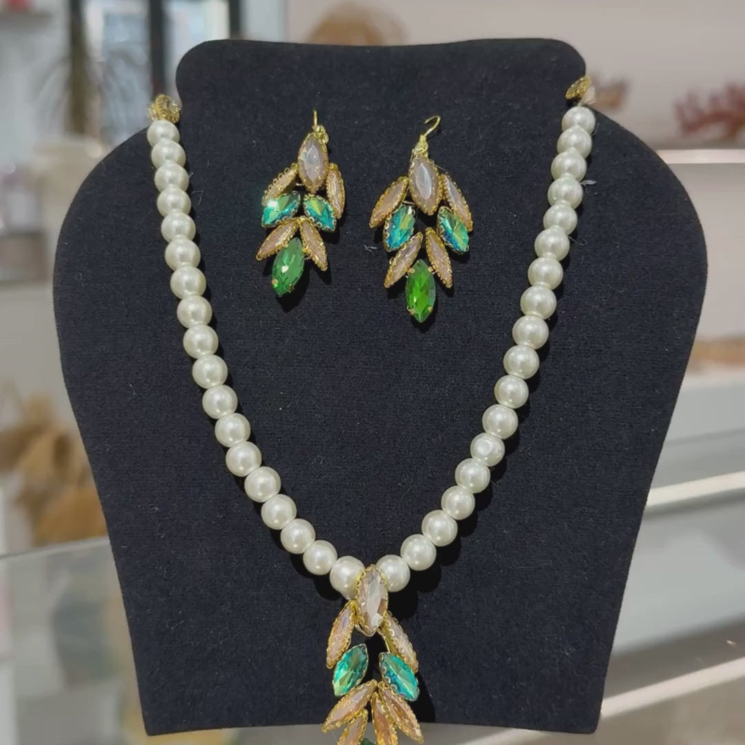 Collier avec boucle d'oreille en perles blanc et pendentif en cristaux Vert – Look élégant