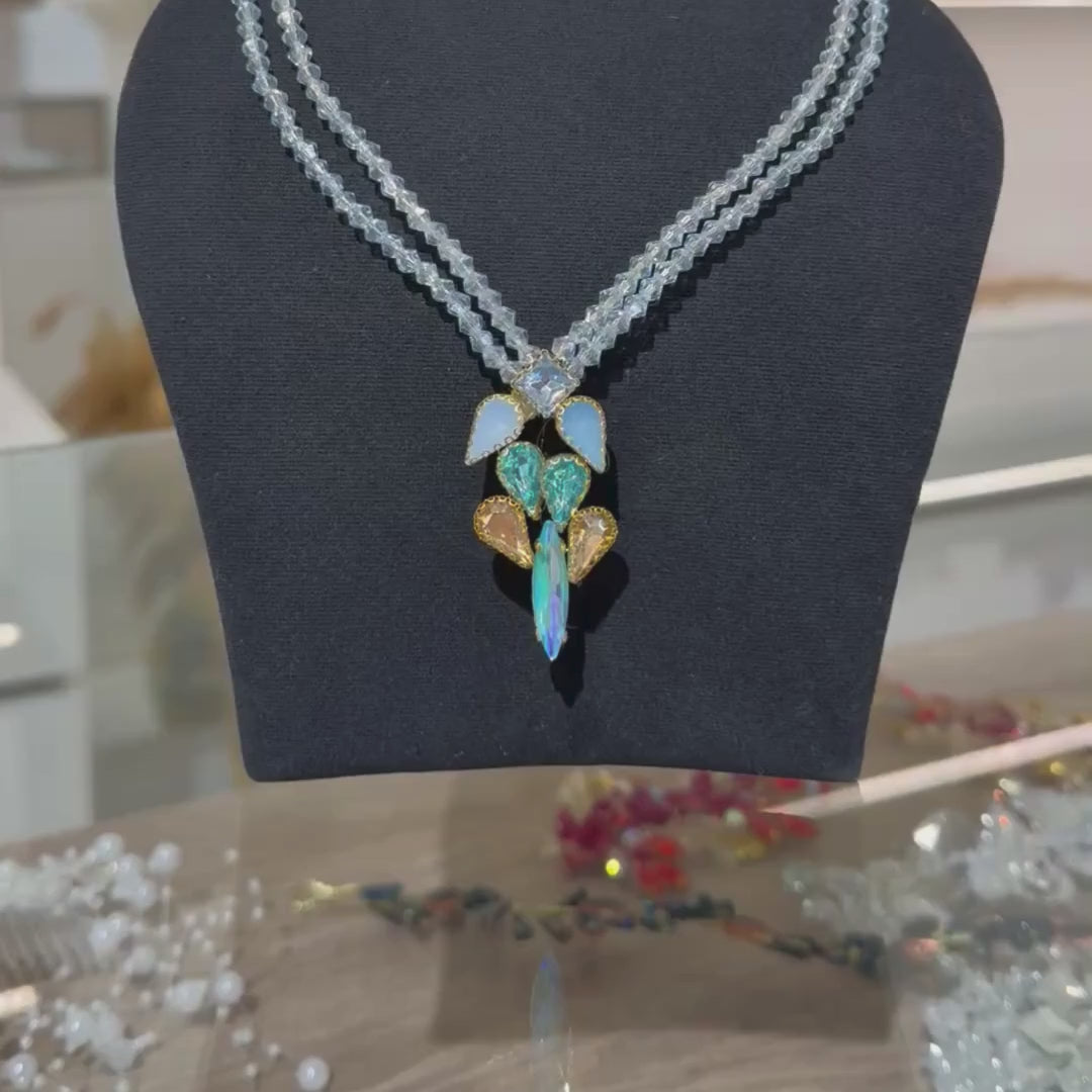 Collier double rangs en perles et pendentif en cristaux bleus – Look élégant
