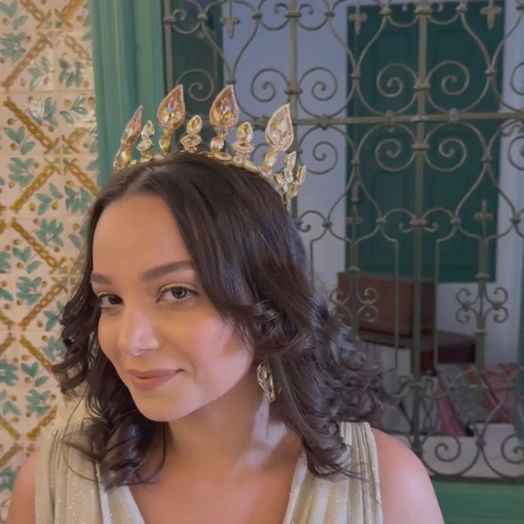 Sublimez votre allure avec cette majestueuse couronne dorée ornée de cristaux et de motifs en forme de goutte scintillante. Ce bijou élégant et raffiné est parfait pour rehausser votre style lors de mariages, réceptions ou occasions spéciales.