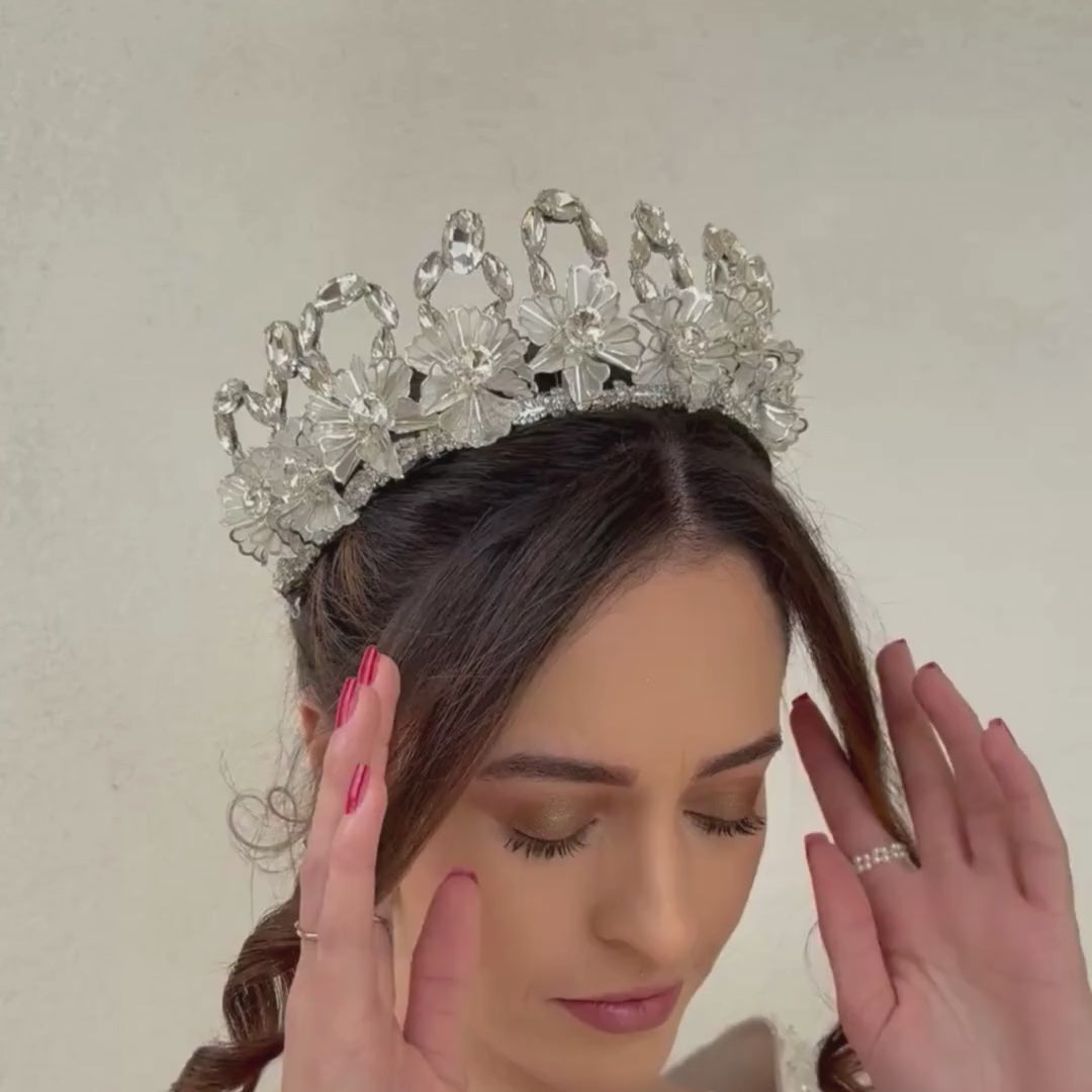 Élevez votre style avec ce somptueux diadème inspiré de la nature, où des motifs floraux délicatement travaillés se mêlent à l’éclat des cristaux. Chaque fleur, composée de pétales argentés ornés de pierres scintillantes, apporte une touche de douceur et de raffinement. Les cristaux ovales et ronds, magnifiquement agencés, captent la lumière pour illuminer votre visage avec élégance.