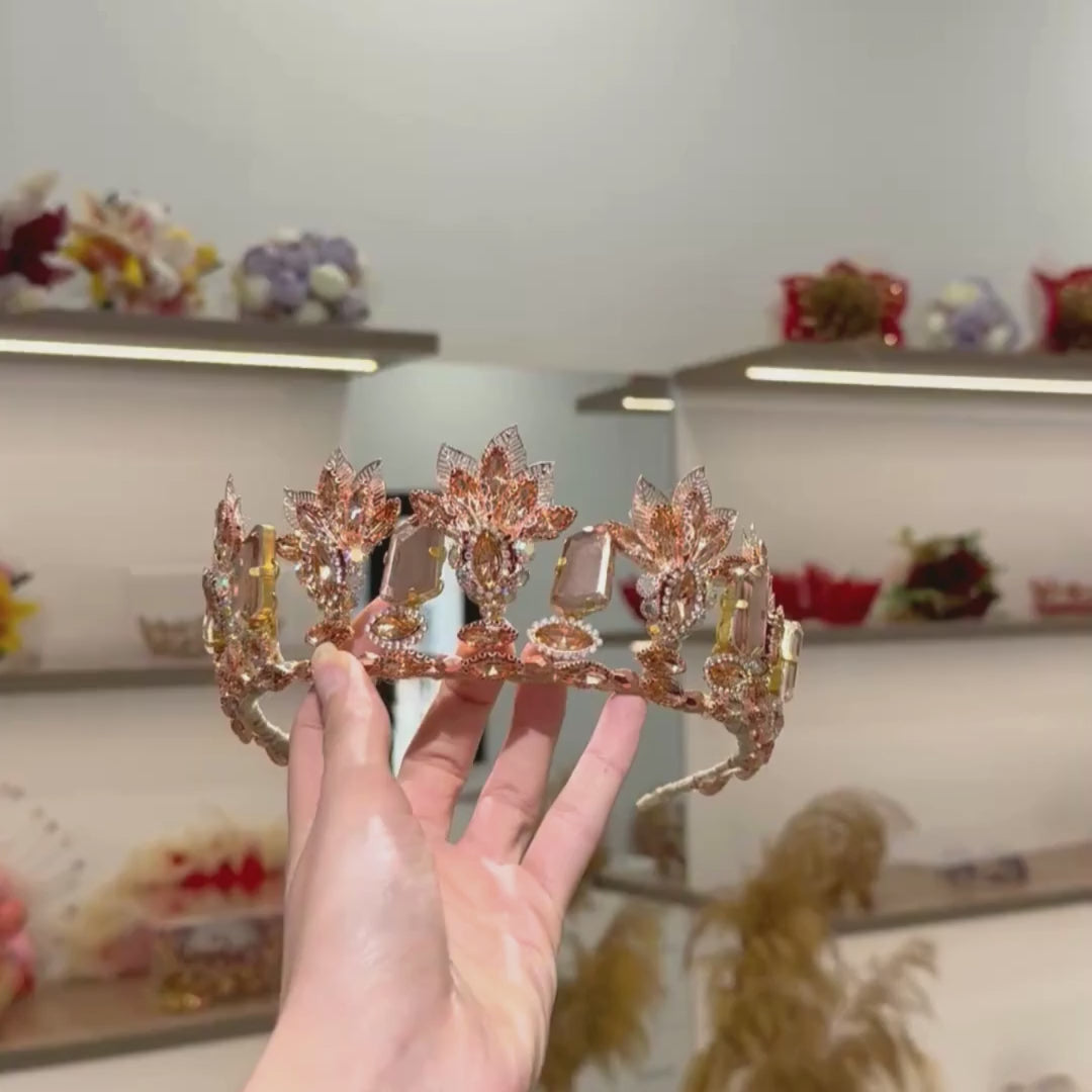 Couronne florale dorée pierres rose nude – Élégance féminine