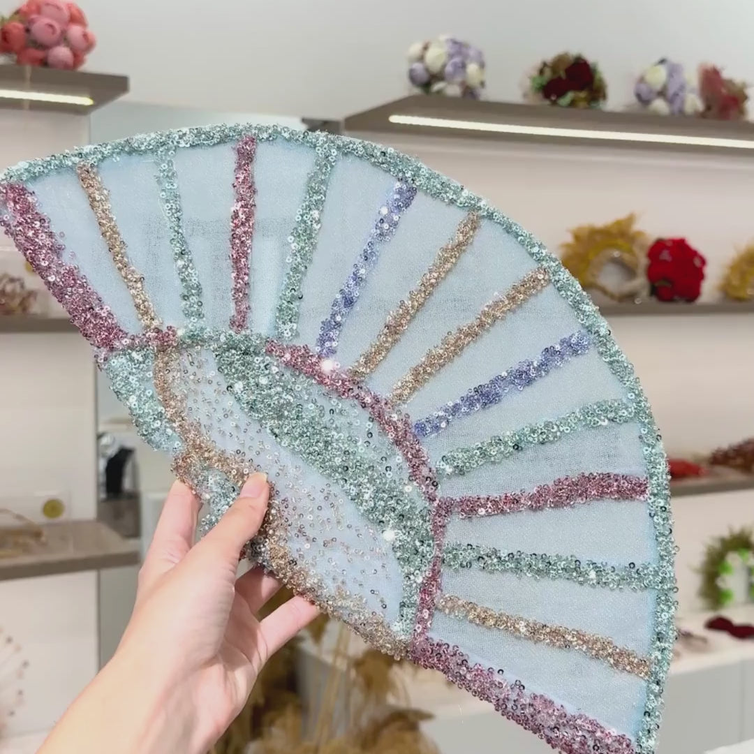Apportez une touche raffinée et lumineuse à votre tenue de mariage ou de soirée avec cet éventail en tulle brodé à la main. Orné de perles et de sequins multicolores (bleu, doré, rose et violet), il reflète la lumière avec élégance et devient l’accessoire idéal pour accompagner une mariée ou une invitée en quête d’originalité.