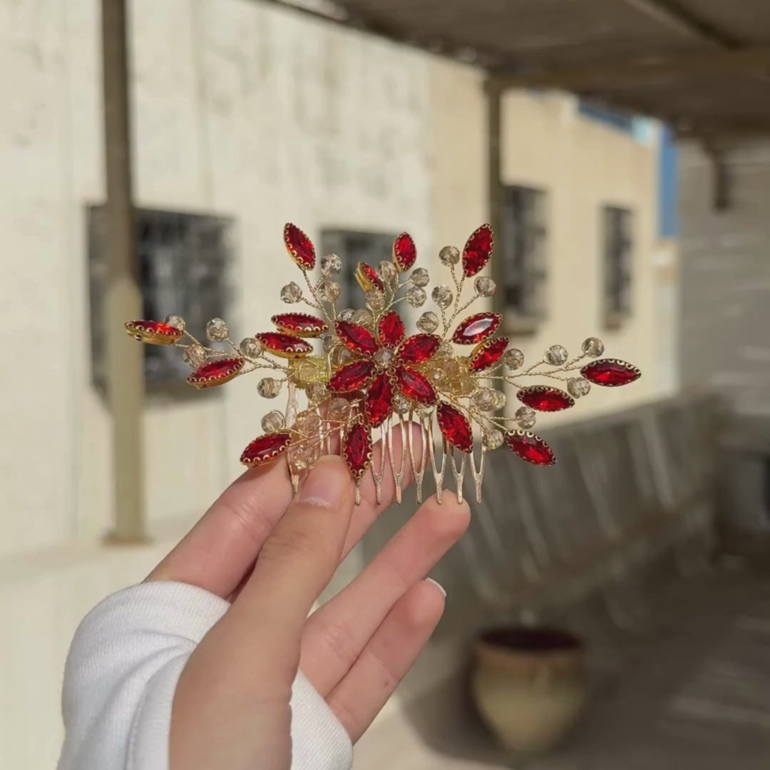 Ses teintes rouges profondes et dorées brillantes en font un accessoire parfait pour les mariages, les fiançailles, les soirées, les fêtes et toutes les occasions spéciales. Les branches décoratives sont légèrement flexibles pour permettre une adaptation facile à différents styles : chignon, demi-queue, coiffure ondulée ou cheveux attachés.
